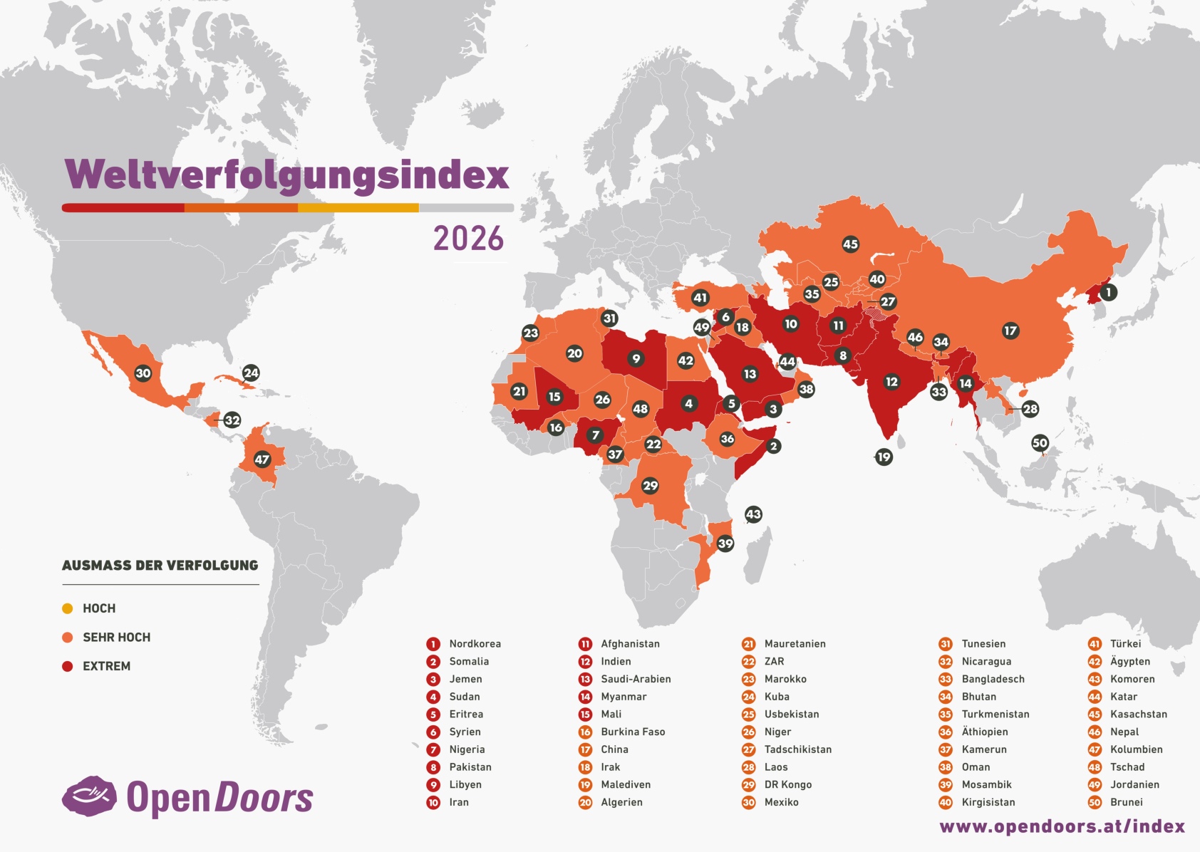 Die Organisation Opendoors ist seit 70 Jahren in 71 Ländern für die verfolgte Kirche im Einsatz. Jedes Jahr erscheint der Weltverfolgungsindex mit den Top 50 Ländern, in denen Christen einem sehr hohen oder extremen Ausmaß an Verfolgung und Diskriminierung ausgesetzt sind. Informieren sie sich über die Situation der Christen in diesen Ländern auf der unten zu sehenden Karte und auf der Hompage von Opendoors.