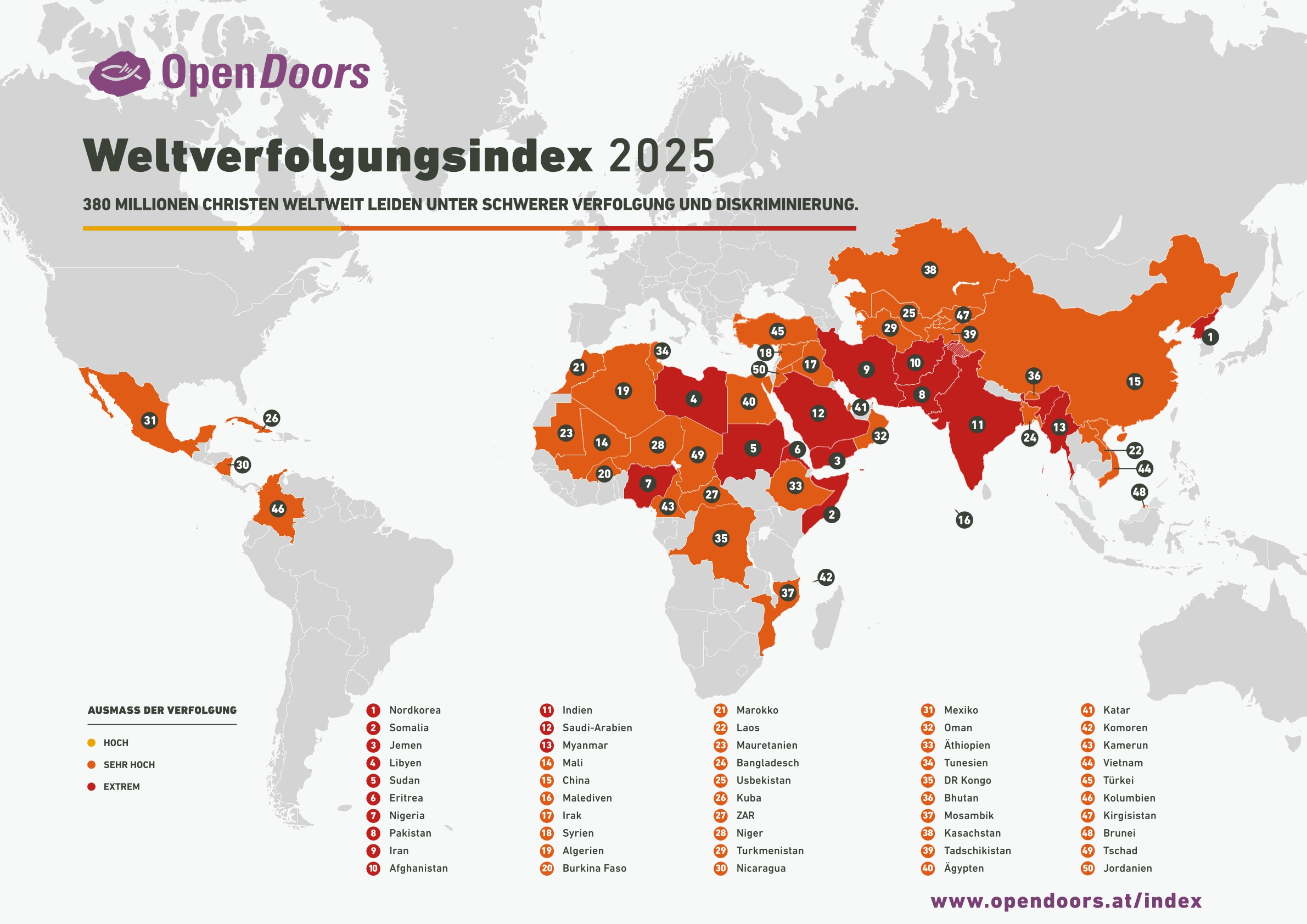Die Organisation Opendoors ist seit 70 Jahren in 71 Ländern für die verfolgte Kirche im Einsatz. Jedes Jahr erscheint der Weltverfolgungsindex mit den Top 50 Ländern, in denen Christen einem sehr hohen oder extremen Ausmaß an Verfolgung und Diskriminierung ausgesetzt sind. Informieren sie sich über diese Länder auf der unten zu sehenden Karte und auf der Hompage von Opendoors.