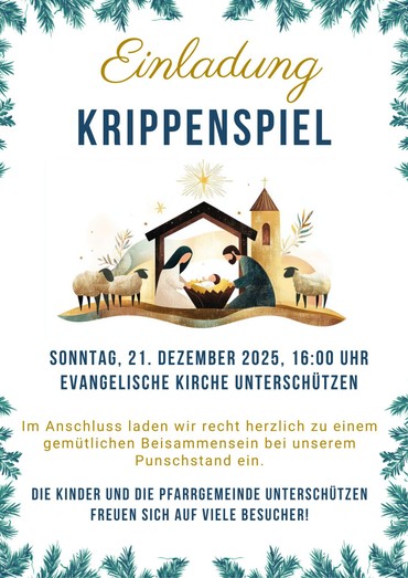 Einladung Krippenspiel am Sonntag, 21. Dezember 2025, 16:00 Uhr, Evangelische Kirche Unterschützen