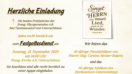 Kein Gottesdienst am Vormittag in Bad Tatzmannsdorf! Stattdessen Festgottesdienst um 14:00 Uhr in der Evang. Kirche Unterschützen. Anlass: 20-jähriges Dienstjubiläum von Pfarrer Carsten Merker-Bojarra.