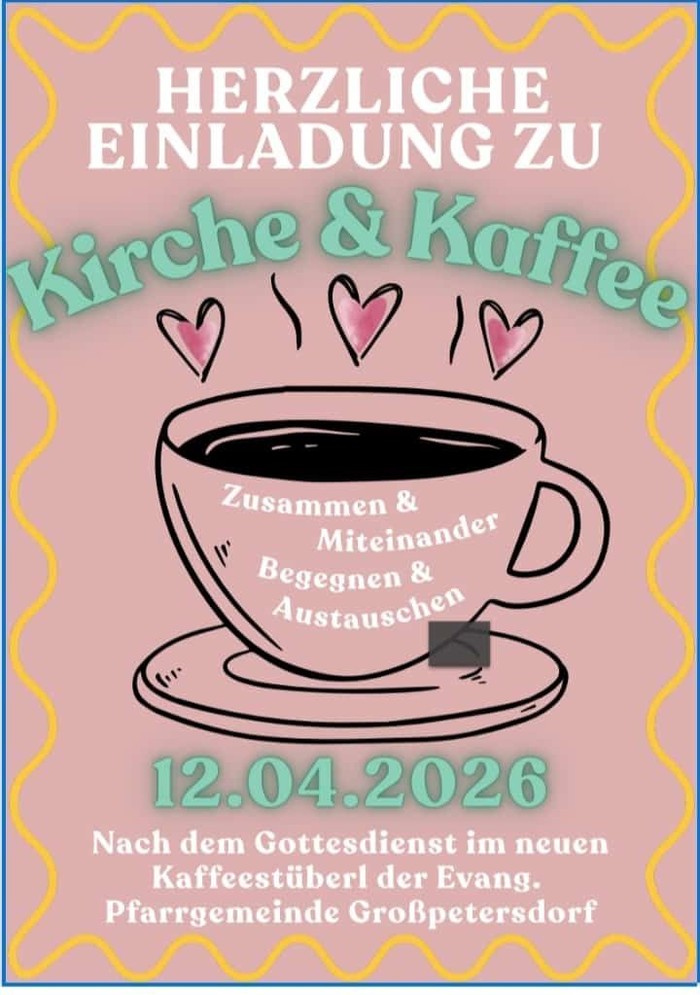 Herzliche Einladung zu Kirche und Kaffee, Sonntag, 12. April 2026 nach dem Gottesdienst, Kaffeestüberl der Evang. Pfarrgemeinde Großpetersdorf