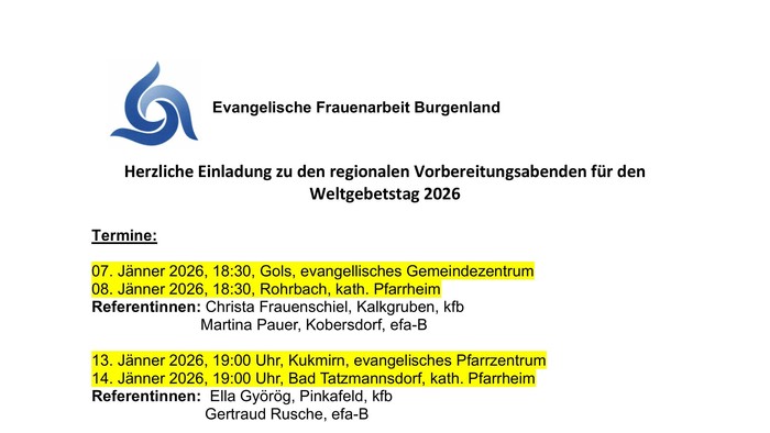 Regionale Vorbereitungsabende für den Weltgebetstag 2026
