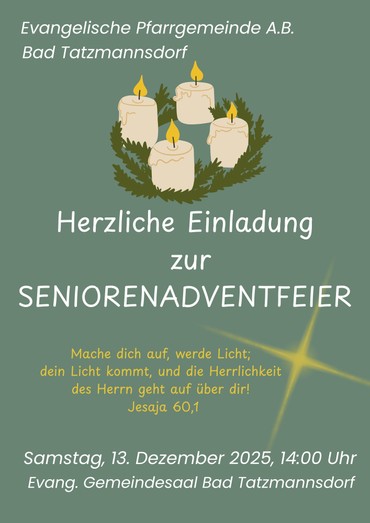Seniorenadventfeier im Evangelischen Gemeindesaal Bad Tatzmannsdorf am Samstag, 13. Dezember 2025, 14:00.